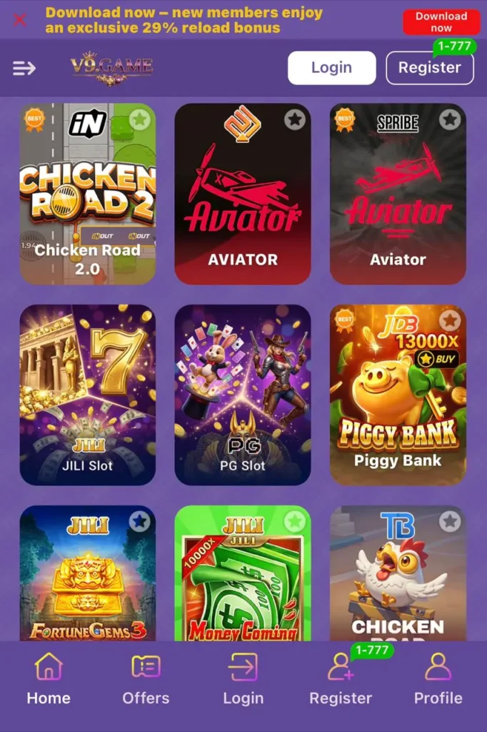 To play games on V9 Game App, first login to your account and open the main dashboard. Choose your favorite game like color prediction, slots, or lottery, then select your bet amount and start playing. Once the round ends, you can win rewards based on your choice and game results.